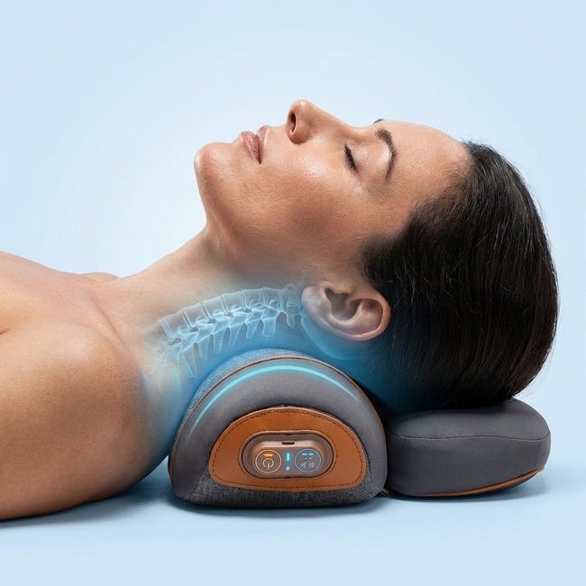Moderne Nackentherapie für zu Hause. CalmNeck™ kombiniert Wärme, Vibrationsmassage und sanfte Nacken-Traktion, um Verspannungen zu lösen und den Druck auf die Halswirbelsäule zu reduzieren. Schon 10–15 Minuten Anwendung können helfen, deinen Nacken spürbar zu entlasten.